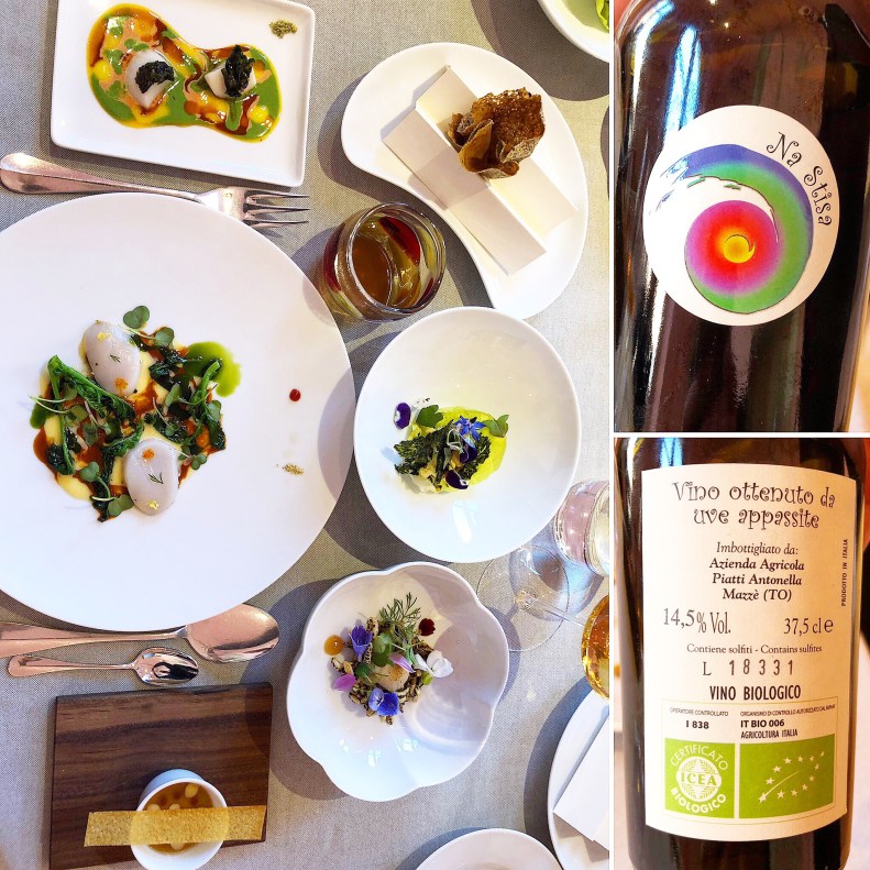 Ci concediamo un twist di questo piatto che prendiamo nella versione del menù Mo(vi)menti. Capiamo subito perché questo menù ha questo nome: 6 piatti con protagonisti le capesante ed i ricci, in un susseguirsi di profumi, colori e sapori tanto diversi tra loro ma sempre perfettamente amalgamati. Per una portata del genere serviva qualcosa di speciale in abbinamento è quello che mi viene proposto è davvero perfetto! Micro produttore che non conoscevo ma che ora adoro grazie a questo vino da uve erbaluce appassite. Un vitigno caratterizzato da un’importante acidità e dal grande carattere in grado non solo di sostenere il piatto ma di fondersi assieme ad esso.