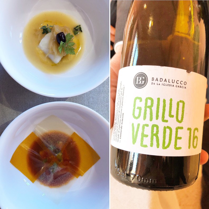 Secondo twist: Merluzzo dal menù Mo(vi)menti. Mi piace molto la numerologia e questo è il caso in cui il numero 2 ricorre sia nel piatto che nel vino. 2 sono i piatti con il merluzzo ingrediente principale proposti per questa portata ma soprattutto il numero 2 è quanto di più rappresentativo per questo vino. Una bellissima storia d’amore nata quando Pierpaolo Badalucco una volta laureato e con l’intenzione di abbandonare il lavoro nei campi, sempre svolto dalla sua famiglia, parte per la Spagna per un master e con l’intenzione di trovare impiego in una banca. Durante gli studi conosce Beatriz, una ragazza andalusa della quale si innamora. Trovato l’amore trova anche il lavoro in banca. Sembra che tutto quello che aveva sognato si sia realizzato ed invece la nostalgia della sua terra lo porta a convincere Beatriz a tornare con lui in Sicilia. Salvano gli ultimi 4 ettari di vigna prima che il padre li vendesse e piantano di fianco ai vitigni classici siciliani del Verdejo e del Tempranillo. Nasce così Dos Tierras! Questo vino è la perfetta unione di 2 persone di 2 culture diverse e di 2 vitigni incredibili: c’è il sole ed il mare dentro! Il Grillo porta intensità ed il Verdejo la freschezza. Dualismo perfetto che si abbina incredibilmente al dualismo di questo piatto.