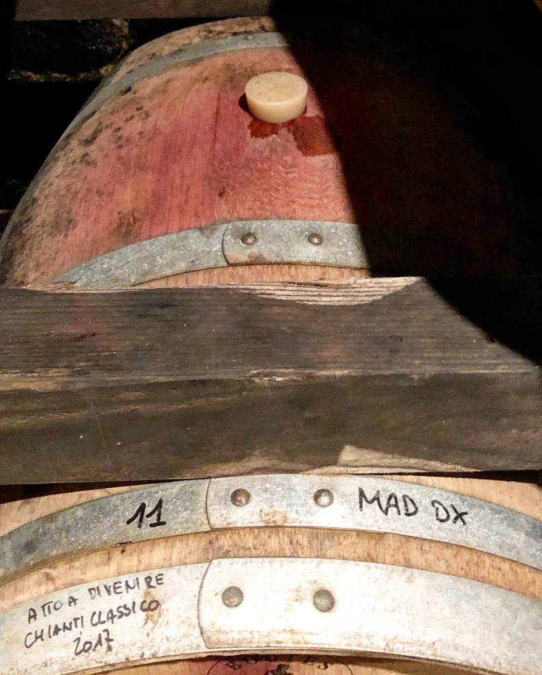 Prima di passare alla degustazione facciamo qualche assaggio dalle botti con Andrea: partiamo da 2 botti provenienti dallo stesso vigneto ma suddiviso in lato destro e sinistro. Quello che andiamo ad assaggiare è un vino “atto a divenire Chianti Classico 2017”.