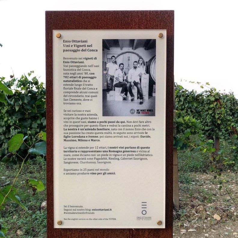 All’interno dell’Oasi naturale del Conca, fiume che delimita le vigne, si erge la cantina Enio Ottaviani che troviamo in fase finale di ristrutturazione. Intervento importante che regala una zona di accoglienza meravigliosa: vetrate sulle vigne ed all’interno un ambiente moderno ed elegante.
