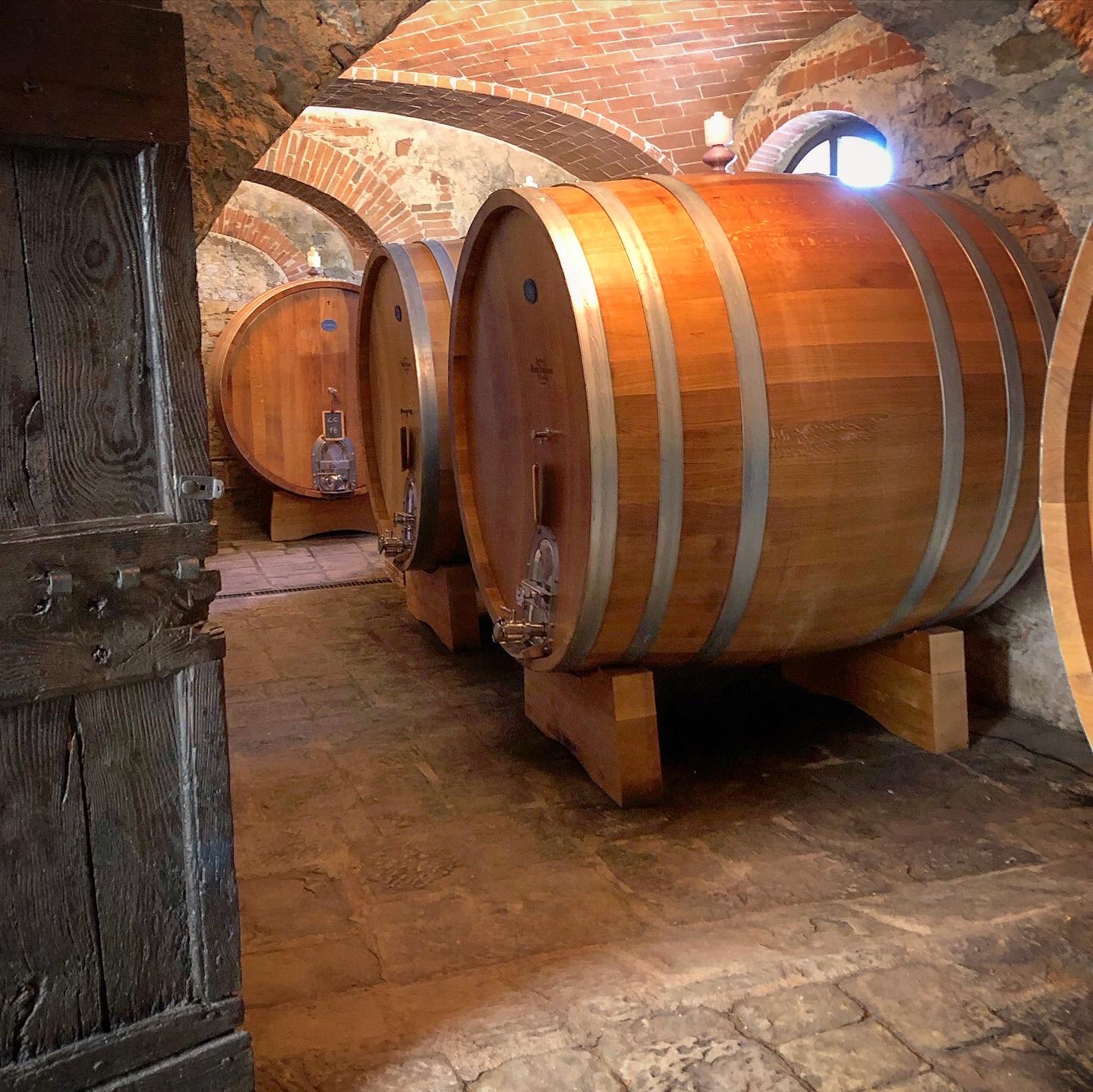 Botti grandi e vasche di cemento, come dicevo, qui il vino invecchia, la parte operativa si trova alla Tenuta I Colli a Monteriggioni. Fuori ci aspetta un tavolo imperiale imbandito dove assieme a dell’ottimo cibo iniziamo la nostra degustazione, siamo a maniche corte, occhiali da sole, sembra di essere ad Agosto!