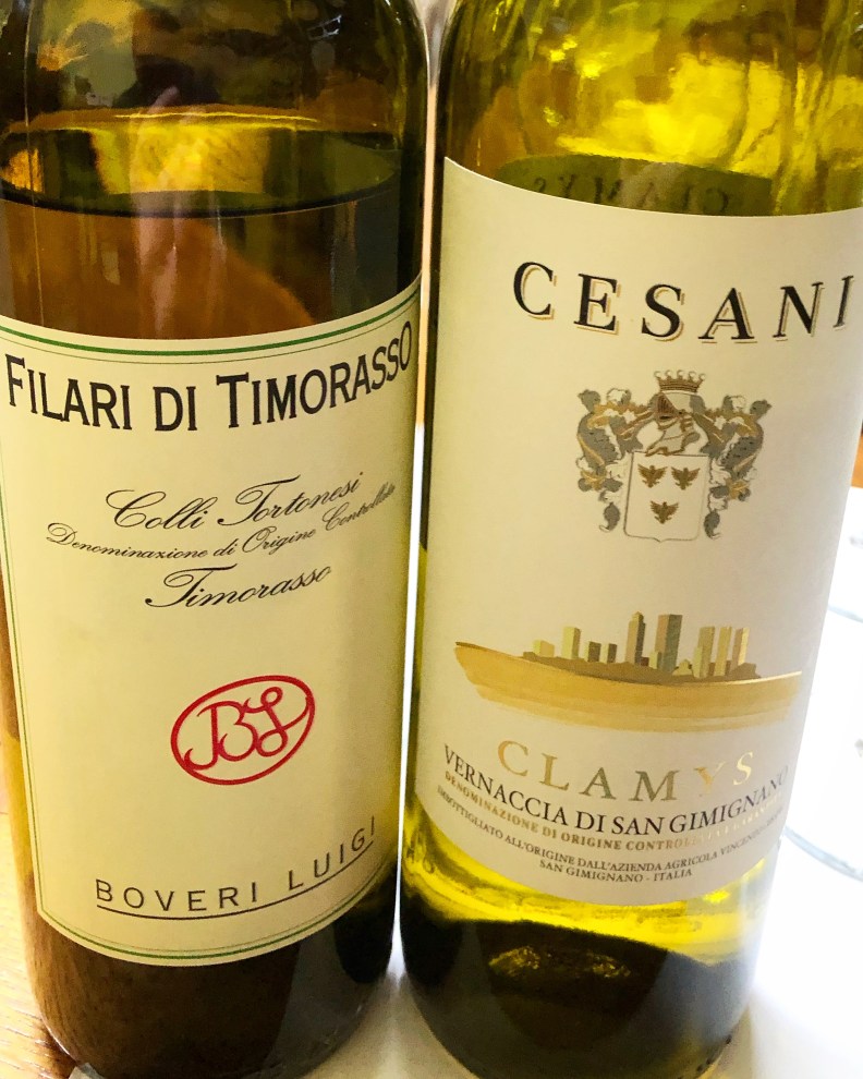 Tra una forchettata di torta salata, salumi e formaggi arriva il momento della mia bottiglia bendata, annata 2017, la stessa del Filari di Timorasso con cui la proviamo a comparare. Il mio intento è quello di paragonare due territori lontani ma secondo me molto simili, due vini e due vitigni che ritengo straordinari. Partiamo dalla bottiglia scoperta, quella di Luigi: la 2017 di Filari è una bevuta esperienziale, un Timorasso che azzera all’istante le tue convinzioni, tanto è diverso dalla norma, tanto è speciale. Lo stesso Luigi ammette, sicuramente con troppa modestia, quanto neanche lui si aspettasse un risultato del genere da un’annata così difficile. Il fatto è che di Filari ne ho bevute diverse annate e questa 2017 è spiazzante, in senso positivo, da quanto è buona e particolare. Agrumato, minerale, sapido, verticale, preciso, queste sono le prima cose che mi vengono in mente. Beviamo insieme il mio vino bendato: vigne ad altitudine similare (circa 300 mt), così come le esposizioni dei vigneti (sud e sud/est), terreni con presenza di scheletro, più marnoso sui Colli Tortonesi, più argilloso ma con grande presenza fossile quello di provenienza del mio vino, entrambi 12 mesi in acciaio, altri 12 in bottiglia per il Filari, 6 per l’altro vino. Anche questo dimostra grande verticalità, sapido, minerale, leggermente più pieno al palato e dal colore più carico. Conveniamo che sono molte le caratteristiche che uniscono i due vini e scopro la bottiglia: Clamys Vernaccia di San Gimignano – Cesani. Due vitigni autoctoni a bacca bianca che adoro e su cui un giorno mi piacerebbe fare una bella degustazione comparativa.