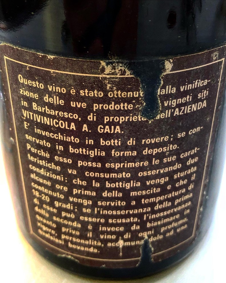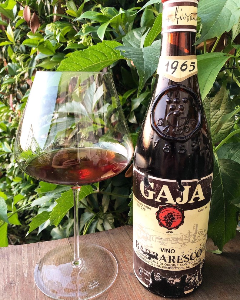 Dopo un immersione tra le più grandi eccellenze chiantigiane è il turno della mia bottiglia bendata, completamente fuori tema ma che riuscirà a farsi perdonare. Seguendo le indicazioni riportate sulla retro etichetta, una poesia post moderna da leggere con attenzione, inizio a “sturare” la bottiglia nel tardo pomeriggio. Paura immensa quando mi accorgo togliendo la capsula che il tappo si è contratto ed è sceso di quasi 1 centimetro. Decido di utilizzare il cavatappi a lame e procedo all’estrazione: tappo non in buonissime condizioni che però esce integro e senza troppi problemi. Secondo step: avvicino preoccupato il naso alla bottiglia, nessun difetto evidente quindi procedo a versare un pò di vino nel calice. Colore mattonato che sfuma sull’unghia, bellissimo. Tutte le paure passano quando lo assaggio: 55 anni che raccontano una storia e lo fanno in maniera magnifica. Bendo la bottiglia e come da indicazione la porto ad una temperatura di circa 16 gradi per servirla poi a 18-20. Quando la assaggiamo bendata nessuno riesce ad intuire di cosa si tratta, un vino certamente datato ma a cui nessuno attribuisce oltre 30 anni. Quando scopro la bottiglia lo stupore è generale: Barbaresco Gaja 1965. Angelo Gaja si era appena affiancato (dal 1961) a suo padre Giovanni, la cui firma è impressa sul collo della bottiglia. Nel calice terziari a non finire: prevale la liquirizia, il caffè tostato, il tabacco essiccato. Emerge anche una sensazione ferrosa ed ematica e continua sorprendentemente a splendere un frutto rosso sotto spirito. Al palato è etereo: mostra ancora una struttura importante, un tannino lieve e elegante, sembra quasi svanire nel finale per poi tornare con prepotenza ed infinita lunghezza. Bevuta indimenticabile.