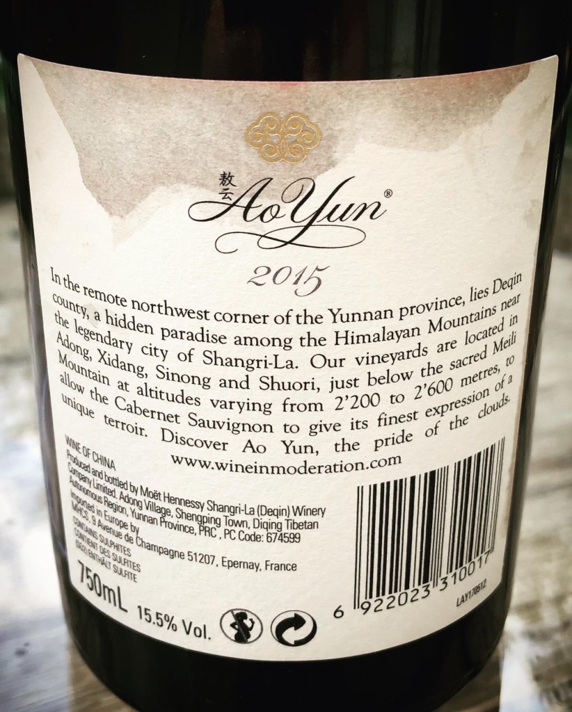 Quando scopriamo la bottiglia lo stupore è generale: Ao Yun 2015, un vino cinese, tibetano per la precisione. Siamo di fronte ad una vera e propria rarità, una bottiglia prestigiosa e dal prezzo molto rilevante. 90% Cabernet Sauvignon, 10% Cabernet Franc. Tra gli asset di LVMH, primo e unico vino cinese a finire nel Liv-Ex toccando anche le 3K sterline a cassa. Siamo nello Yunnan, ai piedi dell’Himalaya, dove sono stati trovati resti di vigneti piantati nell’Ottocento dai missionari Francesi. Le vigne si trovano ad un’altitudine che varia tra i 2.200 e i 2.600 metri ed ecco spiegato il nome che letteralmente significa “volare sopra le nuvole”. L’enologo è Maxence Delou, bordolese con trascorsi a Cheval Blanc e Yquem. Per sopperire al 25% in meno di ossigeno vengono utilizzati contenitori di argilla anzichè di acciaio.