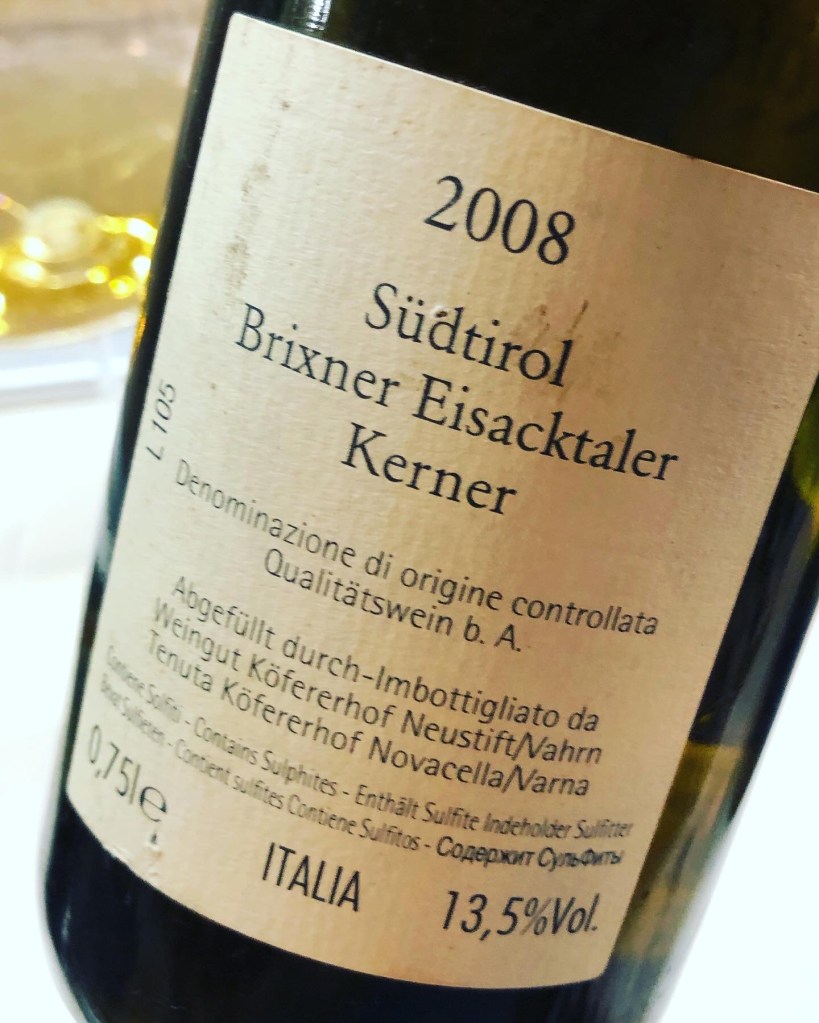 Kerner che in Italia ha trovato il suo Eldorado nella Valle d’Isarco diventando simbolo di tutta l’area. Questa espressione di Kofererhof (annata 2008) è un vero e proprio omaggio sia al vitigno che alla sua terra e dimostra come un vino spesso ritenuto semplice e beverino possa acquisire nel tempo uno spessore sorprendente. Il giallo si trasforma in oro, affiorano terziari dove la componente Riesling si fa sentire con le note di idrocarburo. Poi tanta frutta gialla, anche esotica e leggere note di erbe officinali. Il sorso mantiene ancora grande freschezza e ti fa venire voglia di passare ai calici successivi, uno dopo l’altro. In bendata il più ardito di noi gli aveva dato 9 anni.