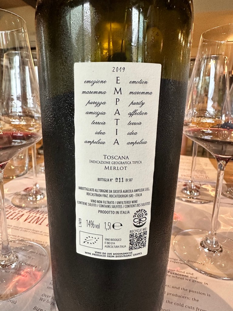 Chiudiamo la degustazione con una inaspettata sorpresa: un Merlot atipico che prende il carattere dal territorio. Non è ruffiano, dominano le durezze. Bellissime note balsamiche e vegetali, di frutti di bosco. Tutto quello che difficilmente ti aspetti da un Merlot toscano.